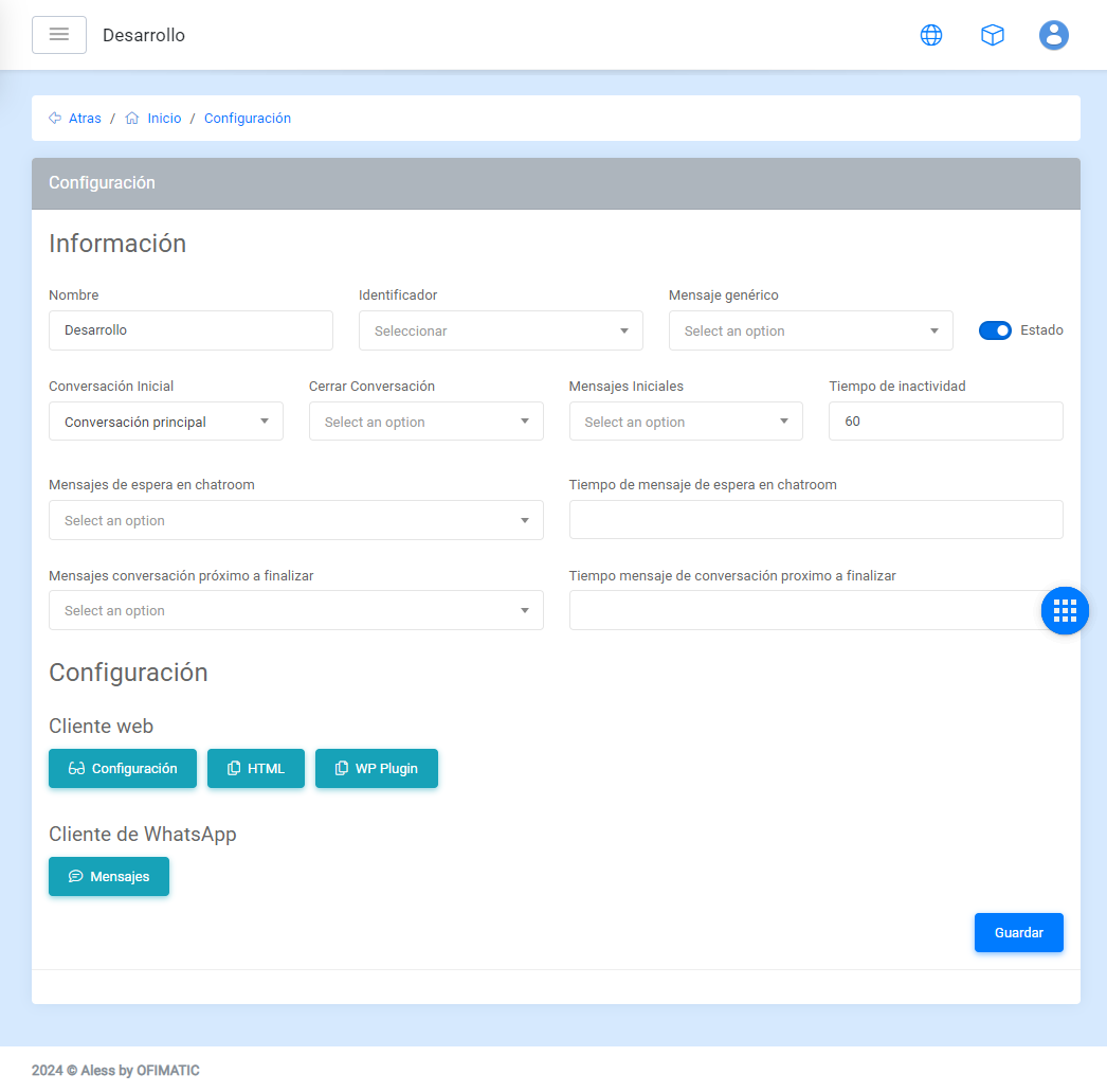 - Tiempo de inactividad: En este campo se coloca el tiempo de inactividad de una conversación en minutos.